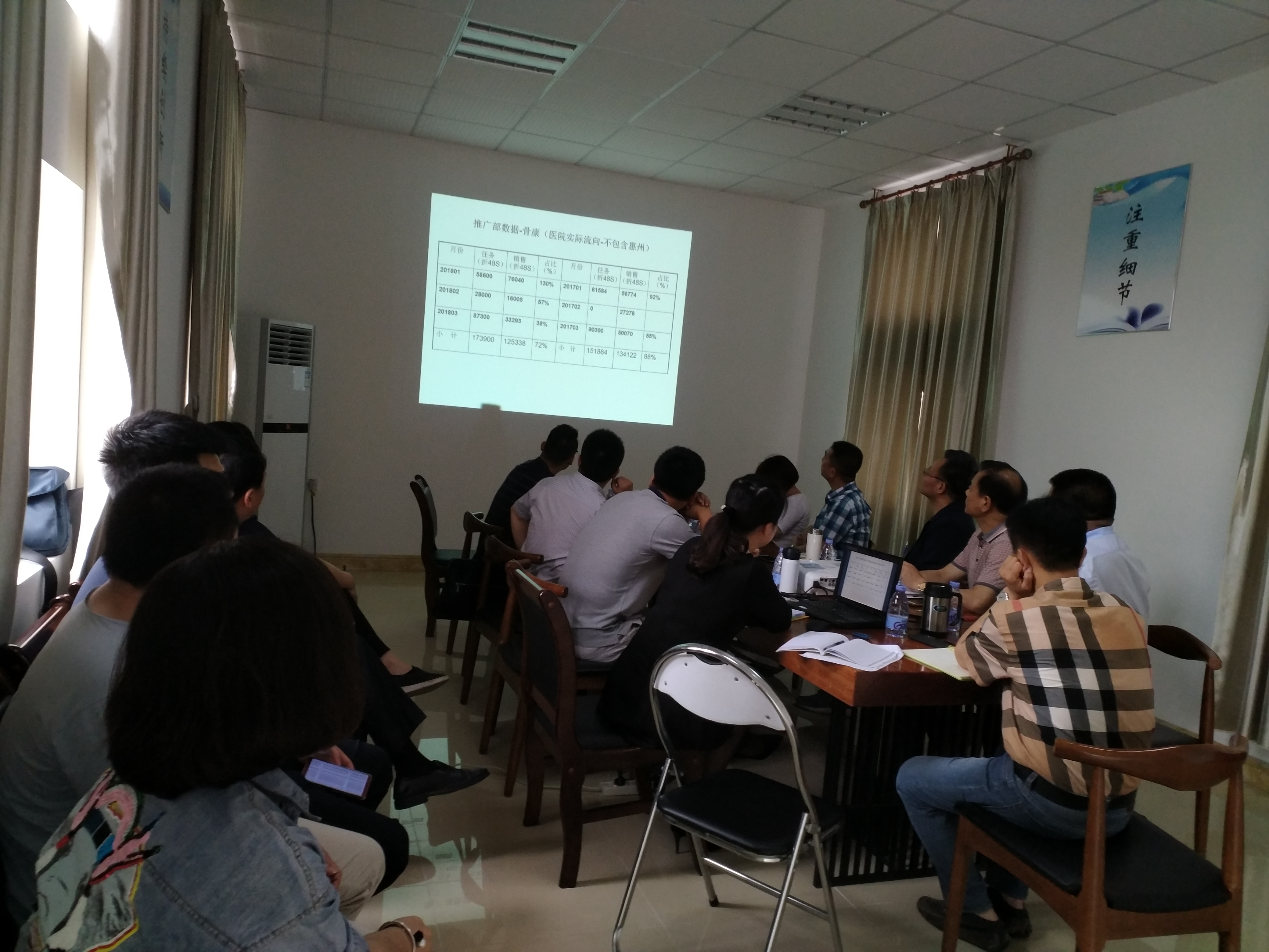 2018年4月23日召開第一季度會議,由各部門負責人匯報第一季度工作總結(jié)。財務(wù)部匯報1至3個月數(shù)據(jù):公司的開票額、推廣部、銷售部、市場部、辦事處、主營產(chǎn)品等。雖然各部門制定的目標與實院成完的比率沒有百分百,但是與去年同期對比略有增長。接下來是二票制的準備工作等。