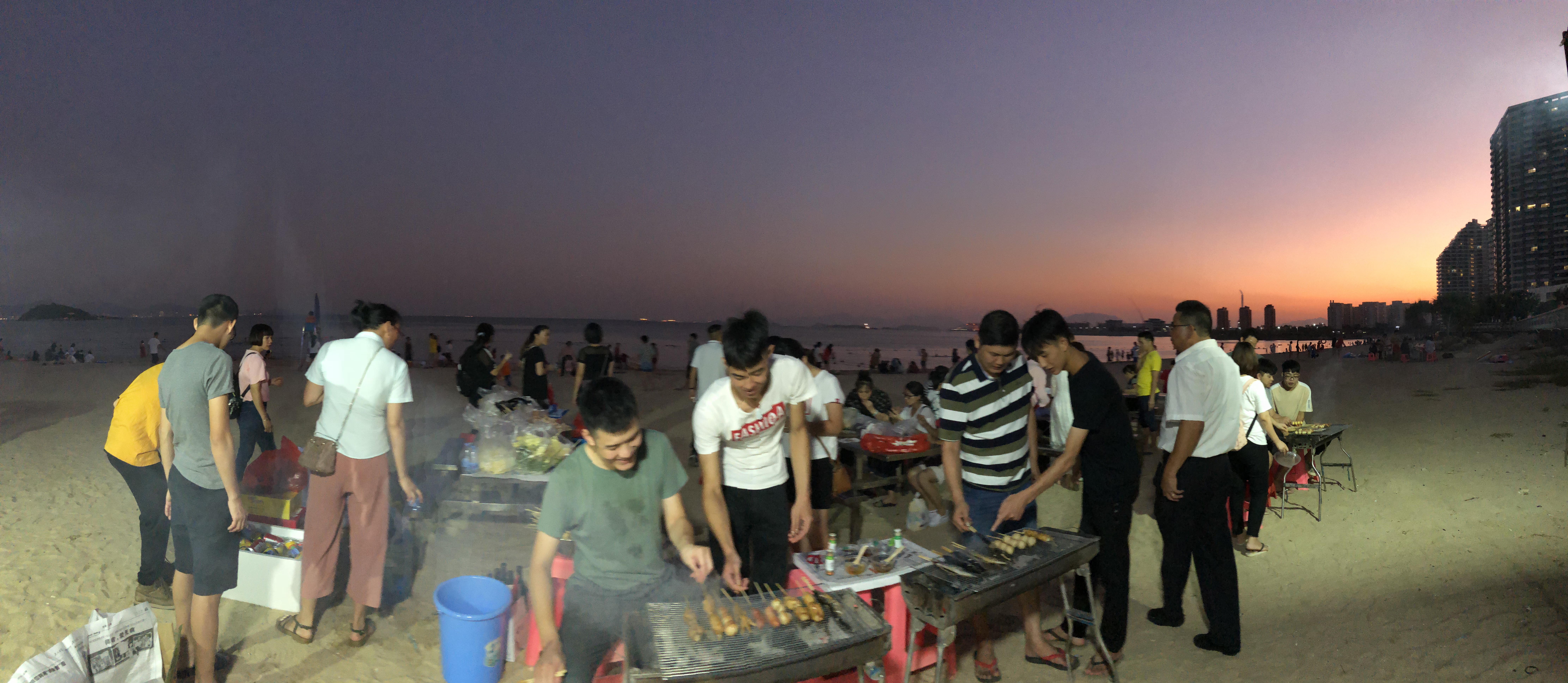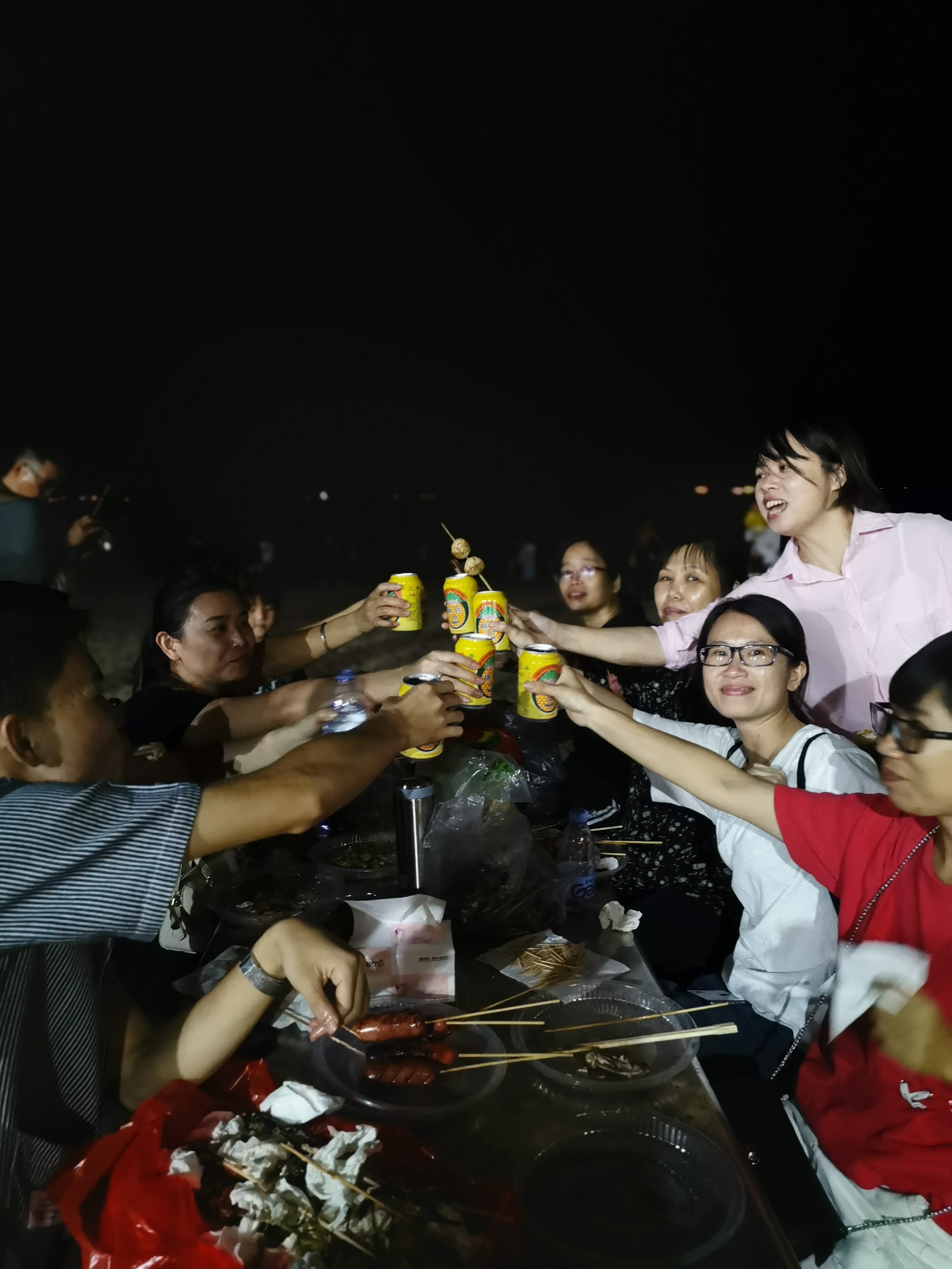 7點鐘正式舉行燒烤晚會,秋高氣爽,月光明媚,平風浪靜,是做燒烤的約會天氣??镜目?,吃的吃,喝的喝好熱鬧,大家沉浸在海邊沙灘的燒烤份圍中……小孩子在海灘上抓螃蟹,大人們在做游戲活動,如老鷹抓小雞等游戲活動。晚10點鐘左右,大家吃好了喝好了玩好了各自休息。