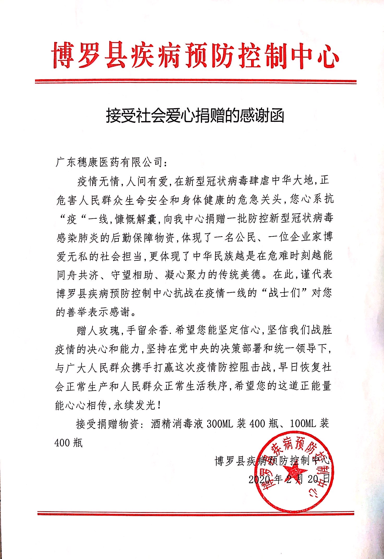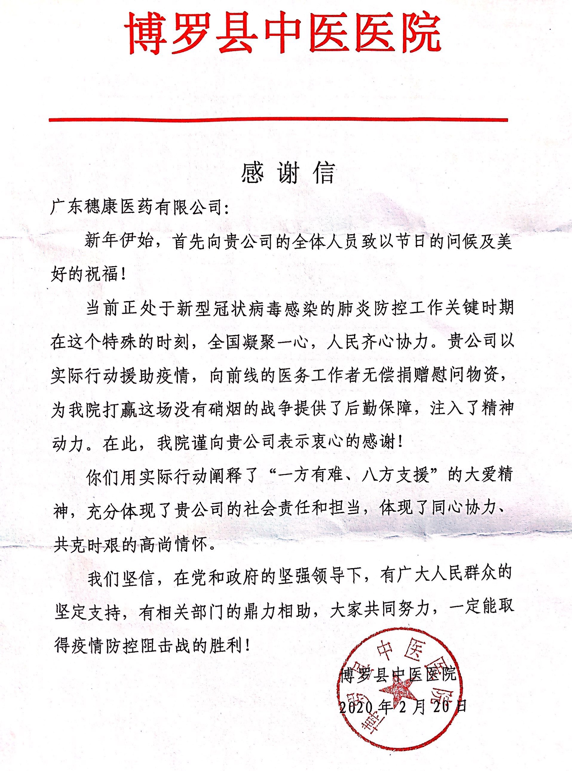 新型冠狀病毒疫情牽動全國人民的心。2020年2月20日,受穗康醫(yī)藥有限公司黃寶壬董事長委托,由公司工會主席陳碧霞一行前往博羅縣中醫(yī)院、博羅縣疾病預(yù)防控制中心捐贈物資:75%酒精、 75%免洗手消毒凝膠。